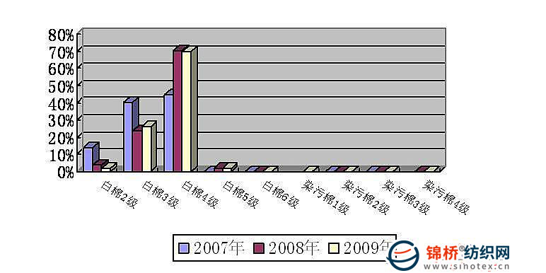棉花的顏色特征是評判棉花質(zhì)量的重要指標(biāo)。色特征檢驗(yàn)是棉花標(biāo)準(zhǔn)改革的核心和難點(diǎn)之一,事關(guān)我國棉花檢驗(yàn)從以品級為代表的感官檢驗(yàn)到儀器化檢驗(yàn)之過渡,具有十分重要的意義。本文分析了天津市近三年棉花儀器化檢驗(yàn)色特征與品級檢驗(yàn)數(shù)據(jù),參考美國色特征檢驗(yàn)情況,對我國棉花色特征檢驗(yàn)和色特征圖進(jìn)行了分析探討。 1顏色特征測試原理 任一物體的顏色,都可以用色度學(xué)的三個基本參數(shù)來描述它的特性,即明度、色調(diào)和飽和度。經(jīng)典理論認(rèn)為,棉花的色調(diào)在孟塞爾色空間的10YR平面上。因此,在10YR色平面上,只要用明度和飽和度兩個坐標(biāo)來刻畫棉花的顏色特性。即用Rd(反射率)來描述棉花明度指標(biāo),用黃色深度(+b)描述棉花飽和度指標(biāo)。 成熟好的棉纖維,由于結(jié)晶度、聚合度和取向度都較高,纖維結(jié)構(gòu)組織緊湊,沉積的纖維素多,外形較接近于圓柱形,因此反射的光線強(qiáng),反射率高。因此通過觀察棉花的色澤特征,可以整體判斷棉花質(zhì)量的好壞,這就是色特征分級的理論依據(jù)。 2天津市近三年棉花色特征與品級檢驗(yàn)分析 2.1儀器化檢驗(yàn)色特征級分布比例 近三年來,天津所儀器化檢驗(yàn)棉花2.56萬噸,從色特征級分布比例來看(見圖1),2007年到2009年,色特征白棉2級的比例連續(xù)減少,白棉3級大幅減少后略有增加,白棉4級則從45%增加到08年的70%,09年和08年相當(dāng),并出現(xiàn)了少量白棉5級及以下等級。 直觀上看,似乎棉花顏色質(zhì)量在下降,但實(shí)際上是由于每年檢驗(yàn)量的差異較大而顯現(xiàn)的。從圖1中還可以看到三年中白棉4級的比例都是最高,其次才是白棉3級。隨著儀器化檢驗(yàn)覆蓋面不斷增加,檢驗(yàn)結(jié)果統(tǒng)計將更加全面地反映天津市棉花加工質(zhì)量的真實(shí)狀況。