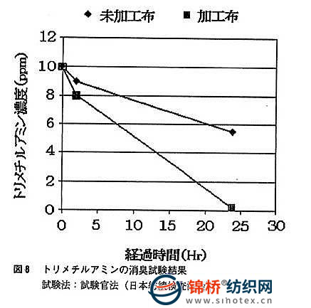 包括汗味、體臭、煙草氣味等)。如圖所示,100%合成纖維窗簾經(jīng)光觸媒加工后的消臭效果結(jié)果(采用乙醛為臭源),可以看出,加工后的織物對(duì)乙醛分解效果十分明顯。