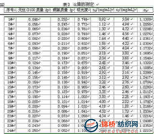 一個(gè)訓(xùn)練集,如表2所示。將每個(gè)樣品用50mL65%硫酸處理,在444nm處測(cè)定溶液的吸光度值。根據(jù)方程(4)、(5)分別計(jì)算出該配比下各自的吸光度,再根據(jù)公式(2)計(jì)算每個(gè)配比下的ai值,見表2。從表2可以看出,計(jì)算得到的ai值分布范圍較窄,為1.1095~1.2704,其平均值為1.2064,RSD為3.38%。該平均值a即可用于根據(jù)方程(3)來(lái)計(jì)算未知配比的天絲G100/銅氨混合物的混紡比。"