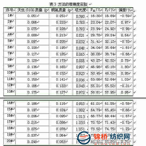 4.3準(zhǔn)確度實(shí)驗(yàn) 本文采用該方法對(duì)已知配比的天絲G100/銅氨二元混合物進(jìn)行測(cè)定,根據(jù)計(jì)算得到的天絲G100的配比FM與實(shí)際配比FJ的差異來(lái)判斷方法的準(zhǔn)確度。 分別稱取天絲G100纖維和銅氨纖維,設(shè)計(jì)了一系列不同配比的天絲G100/銅氨混合物。所有樣品經(jīng)50mL65%硫酸處理后,在444nm處測(cè)定溶液的吸光度值,結(jié)果見表3。根據(jù)混合物的總濃度和線性方程(4)、(5)分別計(jì)算出此濃度的天絲G100和銅氨纖維的吸光度。利用吸光度值,根據(jù)方程(3)計(jì)算天絲G100的配比FM。計(jì)算FM與真實(shí)配比FJ的偏差。從表3的數(shù)據(jù)可以看出,分析結(jié)果與實(shí)際配比的偏差范圍為-1.67~1.80。根據(jù)FZ/T01053-2007《紡織品纖維含量的標(biāo)識(shí)》的規(guī)定,紡織品成分分析結(jié)果應(yīng)該在±5%的允差范圍內(nèi)。因此采用分光光度法對(duì)已知比例的天絲G/銅氨二組分混合物進(jìn)行定量分析,實(shí)際測(cè)量結(jié)果的比例誤差全部在標(biāo)準(zhǔn)的允差范圍內(nèi)。