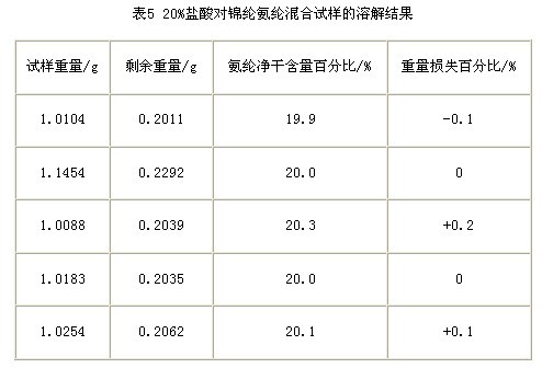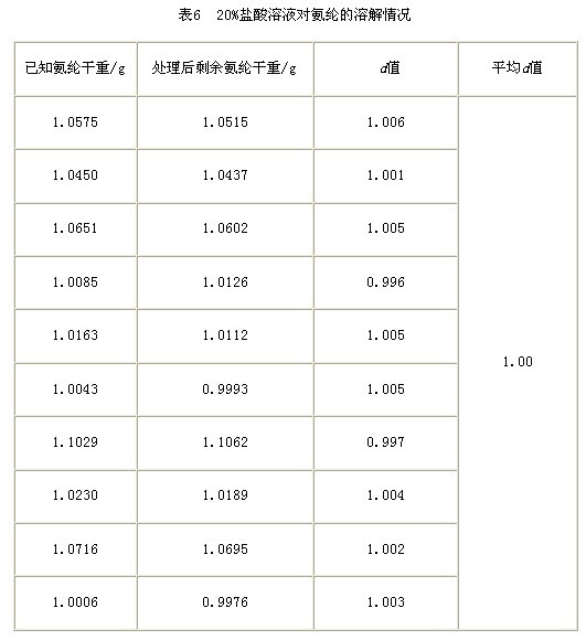從表5來看,在不考慮20%鹽酸對氨綸的影響時(shí),按d值取1.00進(jìn)行計(jì)算,結(jié)果氨綸重量損失百分率在-0.1%~+0.2%之間。這說明20%鹽酸溶解錦綸時(shí)對氨綸基本沒有影響。