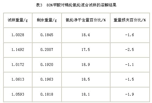 從表3來看,我們在不考慮80%甲酸對氨綸的影響時(shí),按d值取1.00進(jìn)行計(jì)算,結(jié)果氨綸重量損失百分率在-1.1%~-2.5%之間。這說明甲酸溶解氨綸時(shí)對錦綸的影響較大。