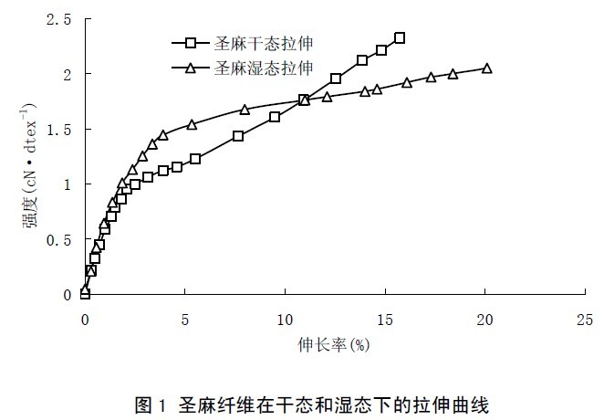?。?)常溫干態(tài)下,圣麻纖維的斷裂強(qiáng)度小于粘膠纖維,其斷裂強(qiáng)度為粘膠纖維的84.4%,斷裂伸長(zhǎng)率大于粘膠纖維,為粘膠纖維的1.19倍。圣麻纖維濕態(tài)下的斷裂強(qiáng)度小于干態(tài)下的斷裂強(qiáng)度,為干態(tài)下斷裂強(qiáng)度83.9%,其濕態(tài)下的斷裂強(qiáng)度的下降程度明顯小于粘膠纖維,濕態(tài)下的斷裂伸長(zhǎng)率為干態(tài)下斷裂伸長(zhǎng)率的1.29倍,圣麻纖維濕態(tài)下的初始模量明顯高于干態(tài)下的初始模量,是干態(tài)下的初始模量的1.43倍。