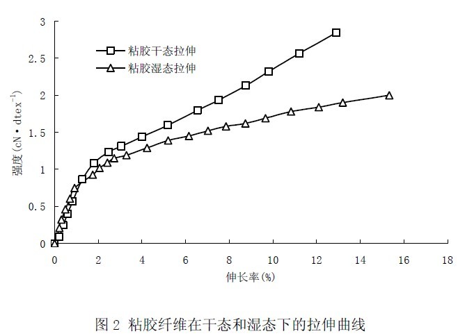 圣麻纖維和粘膠纖維在干態(tài)和濕態(tài)下的拉伸曲線如圖1和圖2所示。