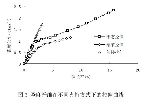 圣麻纖維在不同夾持方式下的拉伸曲線見圖3。
