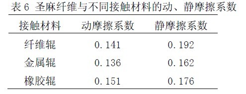 圣麻纖維與不同接觸材料的動(dòng)、靜摩擦系數(shù)如表6所示。