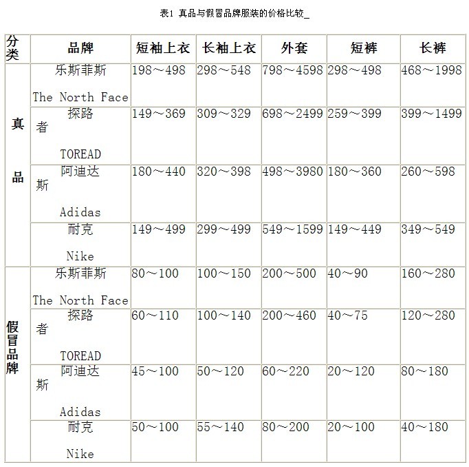 品牌在廣大消費(fèi)者心目中代表了使用者的身份地位和個(gè)性,更重要的是品牌可以給消費(fèi)者一種文化附加值,給社會(huì)傳播一種理念。購買和穿著某一服裝品牌,可使其感受到相應(yīng)的身份、地位、榮譽(yù)和自信,從而獲得心理上的某種滿足和體驗(yàn)。 許多消費(fèi)者都想知道,真假品牌服裝的區(qū)別在哪里?目前市場(chǎng)上較為流行的幾種名牌戶外運(yùn)動(dòng)服裝有TheNorthFace、TOREAD、Adidas、Nike,我們針對(duì)這些品牌服裝的真品和假冒品牌情況進(jìn)行了市場(chǎng)調(diào)研和比較。 銷售價(jià)格的比較 我們對(duì)青島市場(chǎng)在售的以下品牌服裝的價(jià)格進(jìn)行了實(shí)地調(diào)查,見表1。