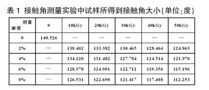 儀器:北京金盛鑫檢測儀器有限公司的JYSP-180接觸角測定儀;日本株式會社日立高新科技那珂事業(yè)所的TM-1000掃描電鏡;上海市精密科學(xué)儀器有限公司的FA2004B電子天平;江蘇無錫愛邦輻射技術(shù)有限公司的GJ-15地那米型電子加速器。