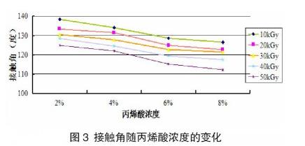 由圖4可以看出,對于每個恒定的丙烯酸濃度,在輻照劑量為10kGy到50kGy之間時,隨著輻照時間的增大,加快了PP大分子產(chǎn)生自由基的速率,自由基的濃度增大,引發(fā)接枝聚合反應(yīng),使得接枝率上升,親水性得到改善,接觸角隨著減小,并且變動幅度基本上恒定,雖然接觸角的測量表明聚丙烯熔噴非織造布經(jīng)過輻照接枝后親水性得到改善,但是改善的幅度不大,可能是與輻照劑量比較小有關(guān)。