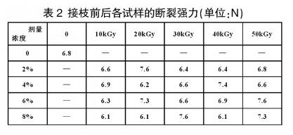 試驗結(jié)果發(fā)現(xiàn),在丙烯酸濃度為2%到8%之間、輻照劑量在10kGy到50kGy之間時,隨著丙烯酸濃度和輻照劑量的增大,厚度和透氣性略有增大,但并沒有與之呈現(xiàn)出明顯的變化趨勢;斷裂強力基本上沒有變化,這也正好符合親水改性但不影響其他性能的要求。