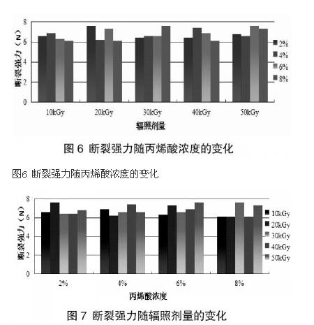 對所得數(shù)據(jù)分別以丙烯酸濃度和輻照劑量為橫坐標(biāo)對斷裂強力進行作圖,可以分別得到斷裂強力隨丙烯酸濃度梯度和輻照劑量梯度的變化如下圖所示。