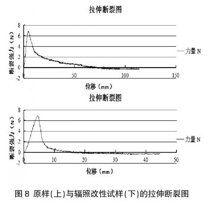 斷裂強力是非織造布力學(xué)性能的重要指標(biāo),通過斷裂強力的測試,可以得到聚丙烯熔噴布在輻照接枝改性前后斷裂強力的變化,據(jù)此可以對比接枝改性前后力學(xué)性能的變化,測試實驗所得到的數(shù)據(jù)如下表所示: