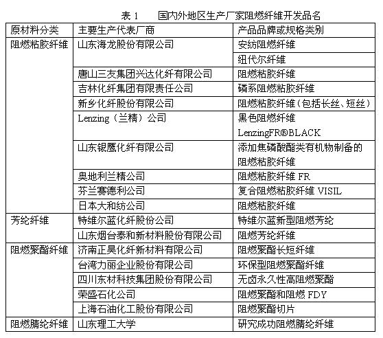阻燃纖維是一種具有良好阻燃性能的高功能纖維。經(jīng)國際權(quán)威檢測機(jī)構(gòu)SGS認(rèn)定,極限氧指數(shù)LOI值大于或等于28%的纖維為阻燃纖維。阻燃纖維按成分可劃分為阻燃滌綸纖維、阻燃粘膠纖維、阻燃腈綸纖維等。而阻燃粘膠纖維是阻燃纖維中非常有發(fā)展?jié)摿Φ囊活惱w維,它有優(yōu)良的阻燃、隔熱和抗熔滴性能,具有生態(tài)與舒適特質(zhì),是功能性與安全性兼具的代表纖維。阻燃粘膠纖維屬于再生纖維素纖維,它是以天然纖維為原料進(jìn)行二次加工制得的,廢棄后在土壤中微生物、水分、空氣的作用下可以自然降解成二氧化碳和水,屬于綠色、環(huán)保、可持續(xù)發(fā)展的纖維原料。阻燃粘膠纖維和聚酯類阻燃纖維相比,阻燃粘膠纖維更加安全。在發(fā)生燃燒時,聚酯類阻燃纖維一般會產(chǎn)生熔滴現(xiàn)象,引燃低燃點物質(zhì)或者燙傷人,造成二次火災(zāi)和傷害,有的會產(chǎn)生大量的有毒煙氣,使人窒息。阻燃粘膠纖維燃燒時直接炭化或固化,不會發(fā)生熔融滴落現(xiàn)象,從而杜絕了二次傷害。阻燃粘膠纖維具有更好的親膚性和染色性,回潮率也較高。小表一為國內(nèi)外地區(qū)部分阻燃纖維生產(chǎn)廠家開發(fā)的產(chǎn)品品名情況。