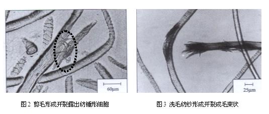 ?。?)羊毛纖維的機械性損傷:羊毛纖維的機械性損傷來自剪毛、洗毛及梳毛等加工過程及蟲蛀,使纖維開裂露出紡錘形細胞或毛束狀[1],如圖2和圖3所示。