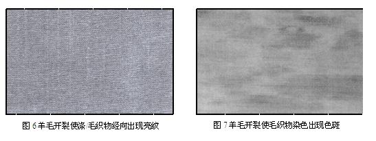 原毛在洗毛過程中,由于洗槽與洗槽之間的輸送設備有缺陷,可能使羊毛纖維受氈化或撕扯而導致機械損傷。這種損傷在整理后的織物上不易發(fā)覺,而在羊毛紡紗過程形成機械破損或回收毛中出現(xiàn)的毛刷狀開裂則較為明顯。