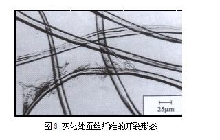 從織物灰化處取出纖維,放在顯微鏡下,可清晰地觀察到纖維開裂、外層剝落或被溶解的現(xiàn)象,如圖8所示。