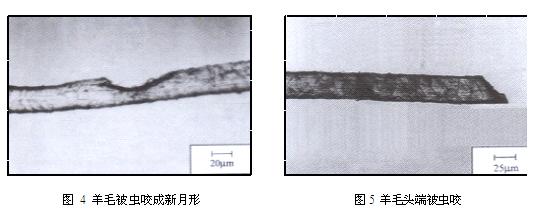 羊毛纖維易被織物蛾、毛皮甲蟲及地毯甲蟲蠶食,在纖維邊緣出現(xiàn)新月形缺口,而在大多數(shù)情況下,纖維的一頭會被咬掉[2],如圖4、圖5所示?!?/p>