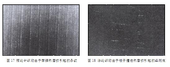 熱學損傷主要發(fā)生在合成纖維織物中,由于合成纖維具有熱塑性,故常利用這一性能進行紡、織、染和服裝加工,如定形和變形加工。在各個工序生產(chǎn)過程中對合成纖維的軟化溫度范圍予以充分考慮,才可避免不可逆的質(zhì)量變化。合成纖維發(fā)生熱損傷可能是直接受熱引起的,如加熱和熨燙;也可能是間接受熱引起的,如摩擦和撞擊使纖維產(chǎn)生熱機械磨損。