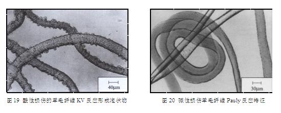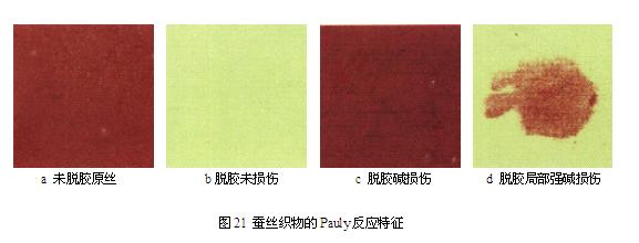 Pauly反應不僅用來檢驗堿性損傷,還可用在酸性損傷和剝鱗羊毛的檢驗中,反應后纖維呈現(xiàn)的顏色也相互交叉,在實際應用中需要分清情況和一定的經(jīng)驗,才能作出正確的判斷。