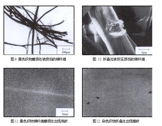 棉纖維的機械性損傷主要是在濕態(tài)下的擦傷和由于折疊受擠壓出現(xiàn)缺口和裂紋,分別如圖9和圖10所示。纖維受擠壓產(chǎn)生的損傷在光學顯微鏡下不易觀察到,而在電子顯微鏡下則十分清晰。擦傷纖維染成黑色后織物表面出現(xiàn)亮紋,如圖11所示。而擠壓受損纖維,由于其結(jié)構變化,染色比未受損纖維更深,織物表面會出現(xiàn)深色折痕線,如圖12所示。