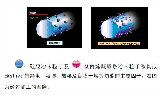 添加有親水基團(tuán)的單體或低聚體聚乙二醇等進(jìn)行共混,能提高纖維的吸濕率,如Ekslive;Ekslive®系東洋紡公司采用吸濕性抗靜電纖維,系透過聚酯聚合方式,將一種吸水率達(dá)到29.0%的粉末利用化學(xué)鍵結(jié)的方式連接到聚酯纖維(吸水率只有0.4%)上,且其吸放濕釋放性能是硅膠的3倍。這種粉末能夠感覺到排汗,透過吸濕排除熱量,進(jìn)而改善織物的飽和吸水性;故該織物能夠維持衣服內(nèi)部的溫度與濕度的平衡性,同時能夠具有很好的吸濕性,并從織物表面放熱,再將濕氣釋放出外面,進(jìn)而使織物表面冷卻,藉此使纖維得以自我干燥,以消除任何濕黏的感覺。由于粉末與纖維分子系以化學(xué)離子鍵結(jié)而成,因此Ekslive®的衣著,即使經(jīng)過數(shù)次的重復(fù)洗滌也不會降低其性能,且還具有其它的一些特性,如除臭、抗菌防臭、pH控制以及抗靜電等多種性能。:硅膠粉末粒子及:聚丙烯酸酯系粉末粒子系構(gòu)成Ekslive®抗靜電、吸濕、放濕及自我干燥等功能的主要因子,下圖為經(jīng)過加工的圖像。