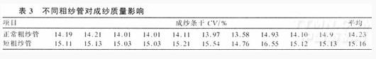 由試驗(yàn)結(jié)果可以看出,用17#車的粗紗,其成紗質(zhì)量明顯優(yōu)于3#車的粗紗;3#車粗紗的差異給細(xì)紗條干CVb值造成嚴(yán)重影響;因此,必須盡最大可能提高粗紗質(zhì)量,減小粗紗臺(tái)間、錠間差異,建立嚴(yán)格的粗紗質(zhì)量把關(guān)制度,嚴(yán)防疵品流人下工序。 1.2粗紗容量影響 在生產(chǎn)實(shí)踐中,由于受粗紗機(jī)型或紡紗品種的限制,在紡?fù)黄贩N時(shí)可能會(huì)使用不同機(jī)型、長(zhǎng)短不一致的粗紗管或大小粗紗交叉混用。由于長(zhǎng)短粗紗管所紡粗紗及大小粗紗管的退繞半徑不同,使其退繞張力不一致,從而造成細(xì)紗牽伸過程中握持力、牽仲力的不一致,導(dǎo)致影響成紗條干質(zhì)量;試驗(yàn)數(shù)據(jù)見表3,