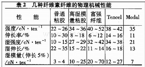 纖維結(jié)構(gòu)上的差異必然會(huì)反映在性能上,表2所示是幾種再生纖維素纖維的物理機(jī)械性能。