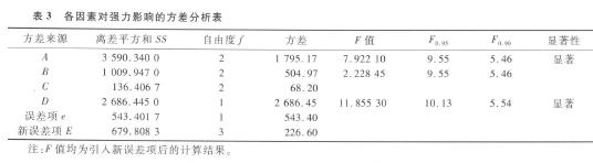 各因素對斷裂強力影響的方差分析結果如表3所示。本試驗采用擬水平法,無空白列存在,但誤差項的離差平方和及自由度均不為零。誤差列離差平方和可由總離差平方和減去各因素列離差平方和求得;誤差列自由度可由總自由度減去各因素列自由度求得。