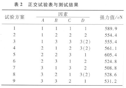 以斷裂強力為試驗指標,建立的正交試驗表如表2所示,其中括號內(nèi)是包芯紗捻向因素(因素D)的真實試驗水平。