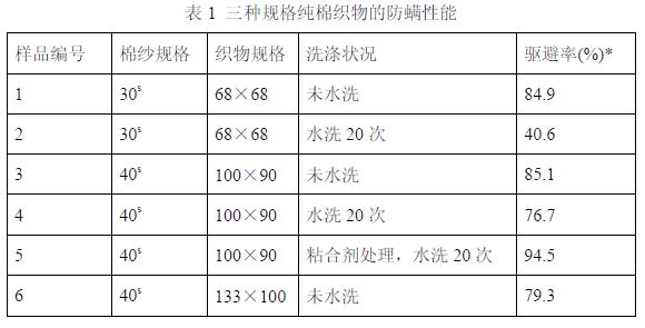 此外,將防螨劑溶解于“頁巖焦油A”溶劑,以山梨酸溶膠2942S、庚烷熔膠100和十二烷基苯磺酸鈣作為乳化劑,充分?jǐn)嚢璩删鶆虻姆莉韯┤橐?。再將此防螨整理劑乳液與聚丙烯腈樹脂、聚酯樹脂、聚氨基甲酸乙酯的乳膠液混合后,對纖維及其織物進(jìn)行處理,賦予纖維制品的耐洗滌性。