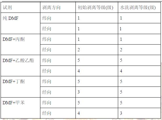 表1不同溶劑+DMF所得膜的剝離強度數(shù)據(jù)比較表
