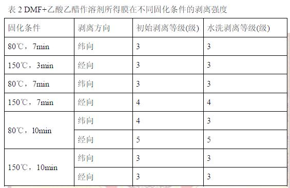 從表2可知,固化條件對剝離強度有很大的影響,初始固化溫度不宜過高,應(yīng)在乙酸乙酯沸點77℃附近固化,文獻[4]表明:當(dāng)溫度接近沸點時,液體的表面張力隨溫度的升高而迅速減少,接觸角也很快趨于零。保持一定的時間,在這段時間內(nèi)充分發(fā)揮乙酸乙酯的擴散作用,使PU與PTFE充分結(jié)合。如果直接高溫固化,如表2中150℃、10min,溶劑在極短的時間內(nèi)揮發(fā)掉,PTFE表面還沒有來得及充分潤濕,因此粘合較差。在乙酸乙酯沸點77℃下固化幾分鐘后(時間依據(jù)所涂PU膜的厚度而定),還需在高溫下繼續(xù)固化幾分鐘,膠粘劑可以充分進行交聯(lián),溶劑也徹底的揮發(fā),很好的固著在PTFE膜上。