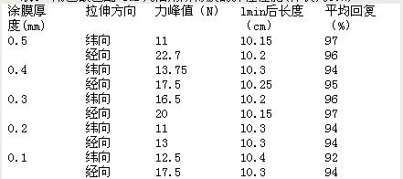 在拉伸過程中,經(jīng)向和緯向所需的力是不同的,這主要是原PTFE膜在雙向拉伸時,2個方向拉伸程度不同造成的。復(fù)合膜回復(fù)性能很好,回復(fù)時間極短,基本上不需要緩彈時間,回復(fù)率基本上可高達95%以上,只是0.lmm和O.2mm涂膜的回復(fù)率稍低于95%,原因是此時膜比較薄,PU含量少,所起的作用就小,但彈性比原PTFE膜要強很多。原PTFE膜的彈性幾乎為零。涂膜厚度最好不要低于0.3mm。