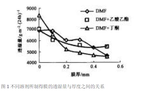 圖1不同溶劑所制得膜的透濕量與厚度之間的關(guān)系