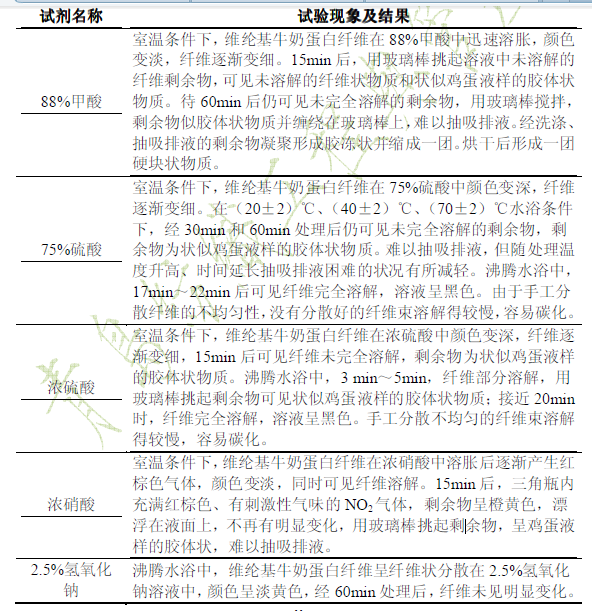 維綸基牛奶蛋白纖維呈淺黃色,是由牛奶酪蛋白和聚乙烯醇大分子共混、共聚、醛化、揉和、脫泡,濕法紡成的纖維,克服了合成纖維吸濕性差和天然纖維強度低的不足,其比電阻介于天然纖維和合成纖維之間,吸濕性也優(yōu)于聚乙烯醇纖維(維綸,PVA),在直接染料、弱酸性染料、活性染料和中性染料中都有良好的上染能力。本文在觀察維綸基牛奶蛋白纖維顯微結(jié)構和燃燒性狀后,研究其在常用化學試劑中的溶解性,為纖維檢測提供參數(shù)。