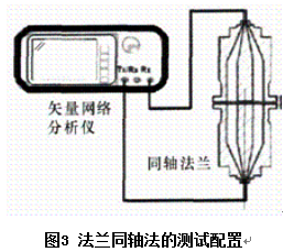 選用法蘭同軸方法對(duì)電磁屏蔽織物的SE進(jìn)行測(cè)試,該方法為NBS推薦,且廣泛應(yīng)用于測(cè)量平面材料對(duì)平面波入射的屏蔽效能(遠(yuǎn)場(chǎng))。測(cè)試配置如圖3所示。
