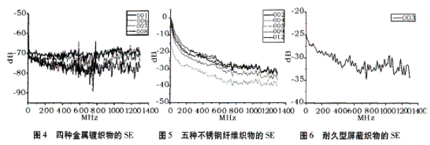 圖中可見,金屬鍍材料表現(xiàn)出最好的SE,對(duì)平面波輻射達(dá)到70-80dB,不銹鋼纖維織物為20-40dB,耐久型屏蔽織物約為30dB。