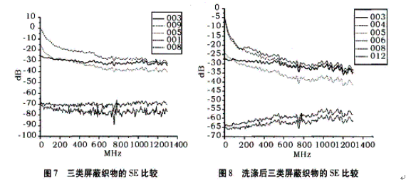 圖7為三類屏蔽織物的SE的比較。此外,為評(píng)估材料的耐磨損特性,所有的試樣都在洗衣機(jī)里洗滌了3次之后并重新測(cè)試。圖8為同種材料洗滌后的SE比較。
