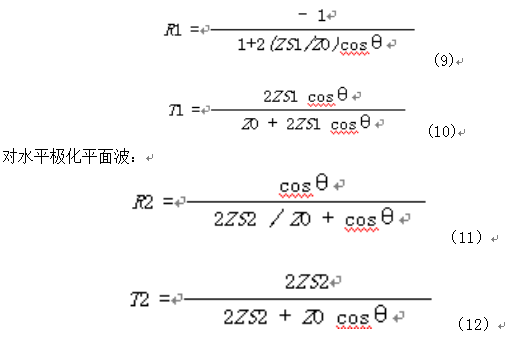 為評(píng)估平面網(wǎng)狀屏蔽對(duì)入射平面波的屏蔽效能,我們僅需要估算電場(chǎng)垂直入射和平行入射兩種極化方向的傳輸系數(shù),每種情況采用合適的表面阻抗特征值。對(duì)垂直極化平面波,其有效表面阻抗為ZS1=ZS。反射和傳輸系數(shù)分別為: