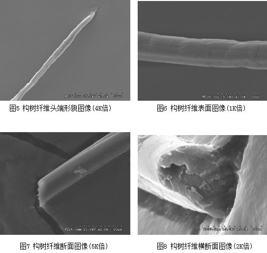 接下來,為了得到分辨率更加高的圖像,采取了掃描電子顯微鏡觀察。圖5~8分別是構(gòu)樹纖維的表面形貌、頭端圖像、截面圖像、橫斷面圖像。