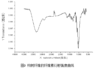 經(jīng)計算fIR為65%左右,可見構(gòu)樹纖維的晶區(qū)取向度偏小,這是未經(jīng)拉伸定形的正常表現(xiàn),一般天然纖維經(jīng)過拉伸,牽伸后取向度都會有明顯提高。