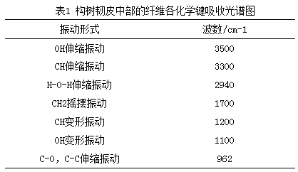 從此光譜圖中可以很明顯看出:A區(qū)3500cm-1~3300cm-1,B區(qū)1700cm-1~1300cm-1,C區(qū)700cm-1~550cm-1為強譜帶區(qū).在A區(qū)中主要是一些醇類,酚類高聚物;在B區(qū)中主要是聚酰胺類,聚脲類等高聚物;在C區(qū)中主要是取代苯,不飽和雙鍵。通過進一步與標準光譜樣圖進行比較,可以總結(jié)出構(gòu)樹韌皮中部的纖維各化學鍵吸收光譜圖,情況如下表1所示。