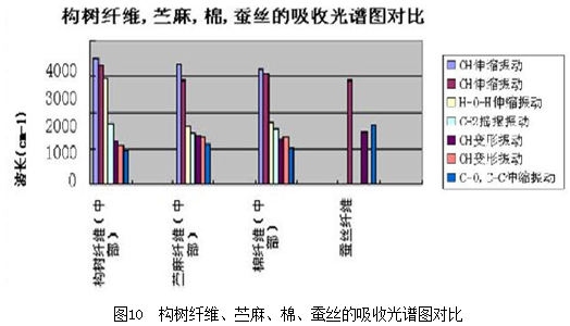 結(jié)合上文中測得的構(gòu)樹纖維的紅外光譜衍射強度圖,構(gòu)樹纖維、苧麻、棉、蠶絲四種天然纖維的吸收光譜圖對比如圖10所示。