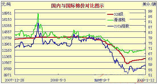 08年11月28日-09年1月12日國(guó)內(nèi)外棉價(jià)對(duì)比圖表