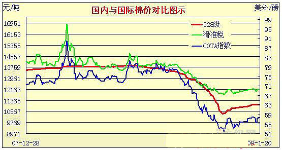 08年11月28日-09年1月20日國(guó)內(nèi)外棉價(jià)對(duì)比圖表