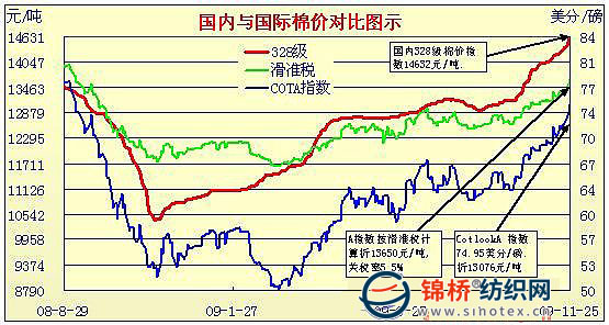 錦橋紡織網(wǎng)—資訊頻道> 棉花信息> cotlook>正文 國內(nèi)外棉價對比圖表(10月30日-11月25日)