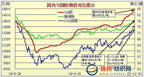 錦橋紡織網(wǎng)—資訊頻道> 棉花信息> cotlook>正文 國內(nèi)外棉價對比圖表(10月30日-11月30日)