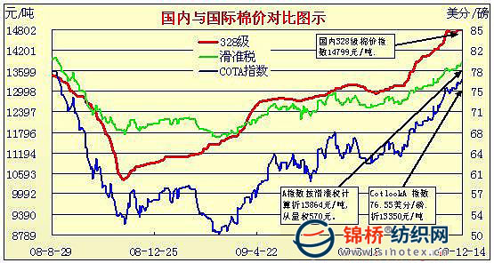 錦橋紡織網(wǎng)—資訊頻道> 棉花信息> cotlook>正文 國內(nèi)外棉價(jià)對比圖表(10.30-12.14)