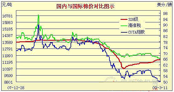 09年2月2日-09年3月11日國內(nèi)外棉價對比圖表
