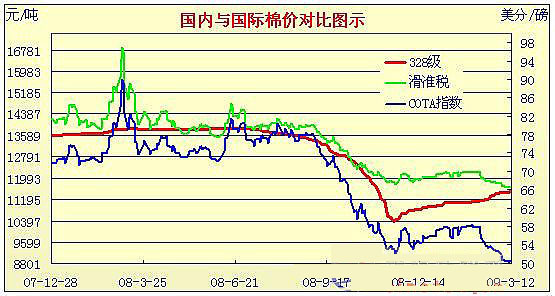 09年2月2日-09年3月12日國內(nèi)外棉價對比圖表